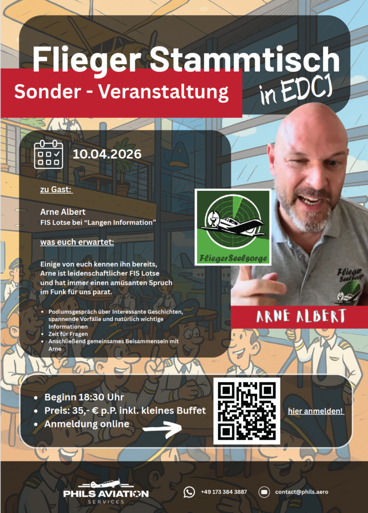 Flieger Stammtisch Frühjahr 2026 Liebe Piloten, wir laden wieder zu unserem Fliegerstammtisch im Frühjahr 2026: Termin: 10.04.2026 Genauere Informationen findet Ihr auf dem Flyer. Zusätzlich werden folgende Weiterbildungen in EDCJ angeboten: https://www.phils.aero/shop/Kurse